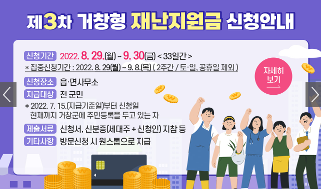 22년 7월 15일 기준으로 거창군에 주민등록상 주소로 등록이 되어 있는 시민을 기준으로 재난지원금이 지급된다고 합니다. 하지만, 사망자나 외국인, 재외국민은 제외가 되는데 예외 사항도 있으니 외국인도 이에 대해 한번 자세히 알아보실 것을 추천합니다.