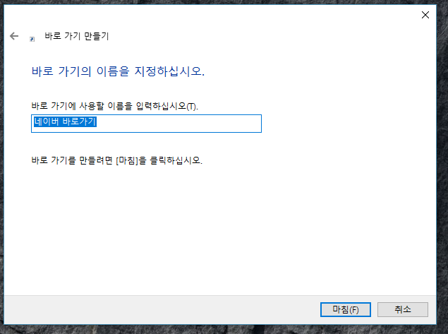 그리고 바로가기에 사용할 이름을 본인이 직접 적습니다. 본인 마음대로 적어도 됩니다. 그리고 마침(F)을 누르면