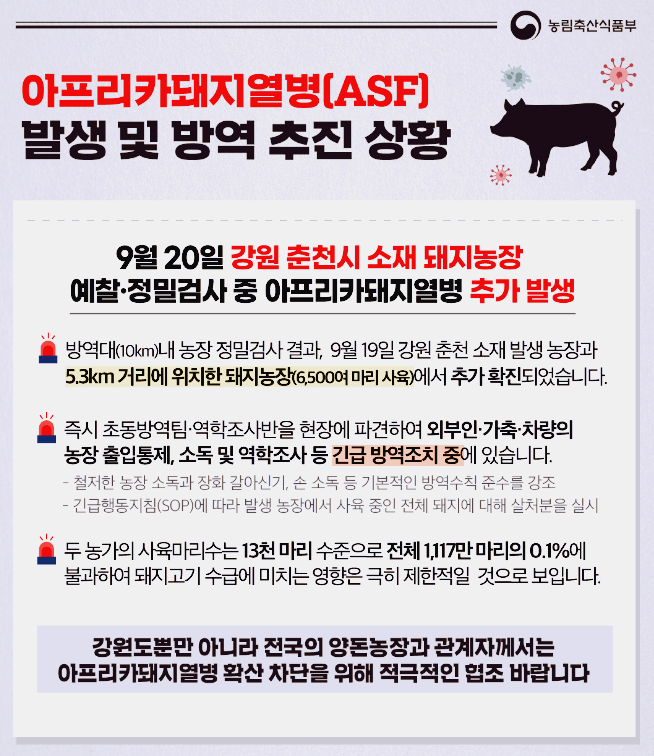 가축전염병중 특히 돼지와 연관된 병은 다양합니다. 그 중 하나인 아프리카돼지열병(ASF, African swine fever)는 출혈열의 특징을 갖고 바이러스의 병원성이 다양하며 병원성에 따라 이병율과 치사율이 달라지기는 하나 급성형의 경우에는 치사율이 100%에 달하며 전염력이 강한 바이러스성 돼지 질병입니다.이러한 문제가 있는 경우 병에걸린 돼지를 섭취하게되면 심각한 위장 장애, 구토, 설사, 두통 등의 증상을 유발할 수 있습니다. 특히 생걸로 먹으면 더이상 답이 없지요.
