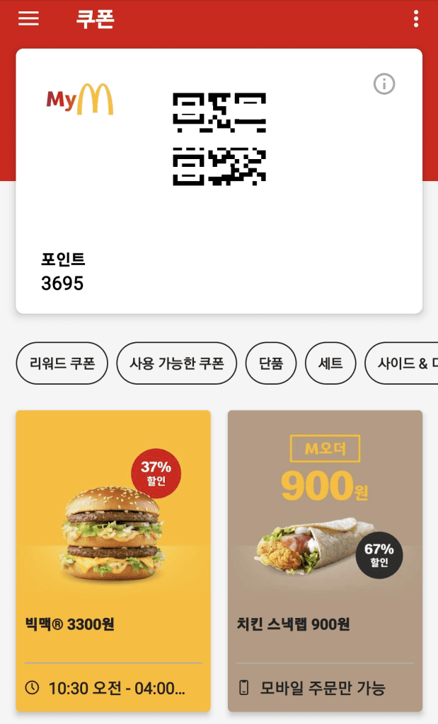 쿠폰의 경우 사용할 수 있는 시간이 정해져 있습니다. 주로 맥모닝과 일반 햄버거가 대표적인데 사용할수 있는 시간을 확인 하고 사용하셔야 합니다.