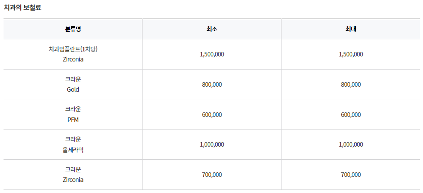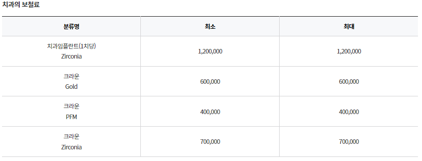 강남지인 치과의원의 경우 임플란트는 지르코니아만 가격이 공개 되어있습니다. 120만원으로 되어 있으며 크라운은 골드,PFM,지르코니아등 30만원~70만원 사이에 가격이 측정 되어있습니다.