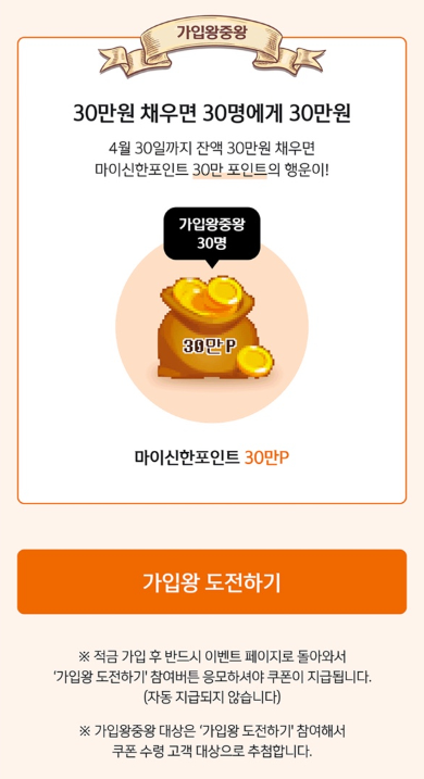 또한 4월 30일 까지 잔액 30만원을 채우면 추첨을 통해 마이신한 포인트 30만 포인트까지 지급이 되니 이 부분 꼭 참여하시길 바랍니다!