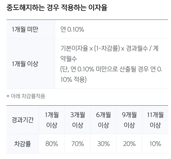 만기전 예금 해지시 중도해지이자가 적용됩니다. 이는 일반 가입할 때 금리보다 낮을 수 있습니다. 다만 본인결혼, 전세 및 월세계약, 주택구입시는 특별중도해지라고 하여 신규적용 기본이자율이 적용되니 참고하시길 바랍니다.
