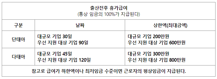 일단 결론적으로 임금의 100%가 지급됩니다. 다만, 우선 지원 대상 기업으로 신청된 회사에서 일한다면 단태아 90일을 기준으로 급여가 고용보험에서 지급이 되며, 다태아 120일의 기준으로 대기업의 경우 최초 60일의 급여는 사업주가, 그 이후 30일은 고용보험에서 지급이 됩니다. 사실 이 부분은 회사와 나라에서 해주는 것이니 굳이 걱정 안 하셔도 될 듯합니다.