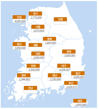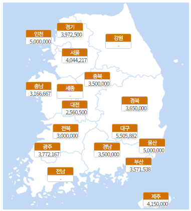 500모 단위에서는 가격대가 확 올라갑니다. 경북과 인천의 경우 가격이 300만원이라는 높은 평균 금액을 가지고 있으며 그나마 충북의 경우 100만원대로 가격이 제일 저렴 합니다.