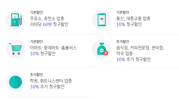 전월 실적 60만원 이상이면 해당 업종에서 통합 월 최대 5천원까지 할인됩니다.